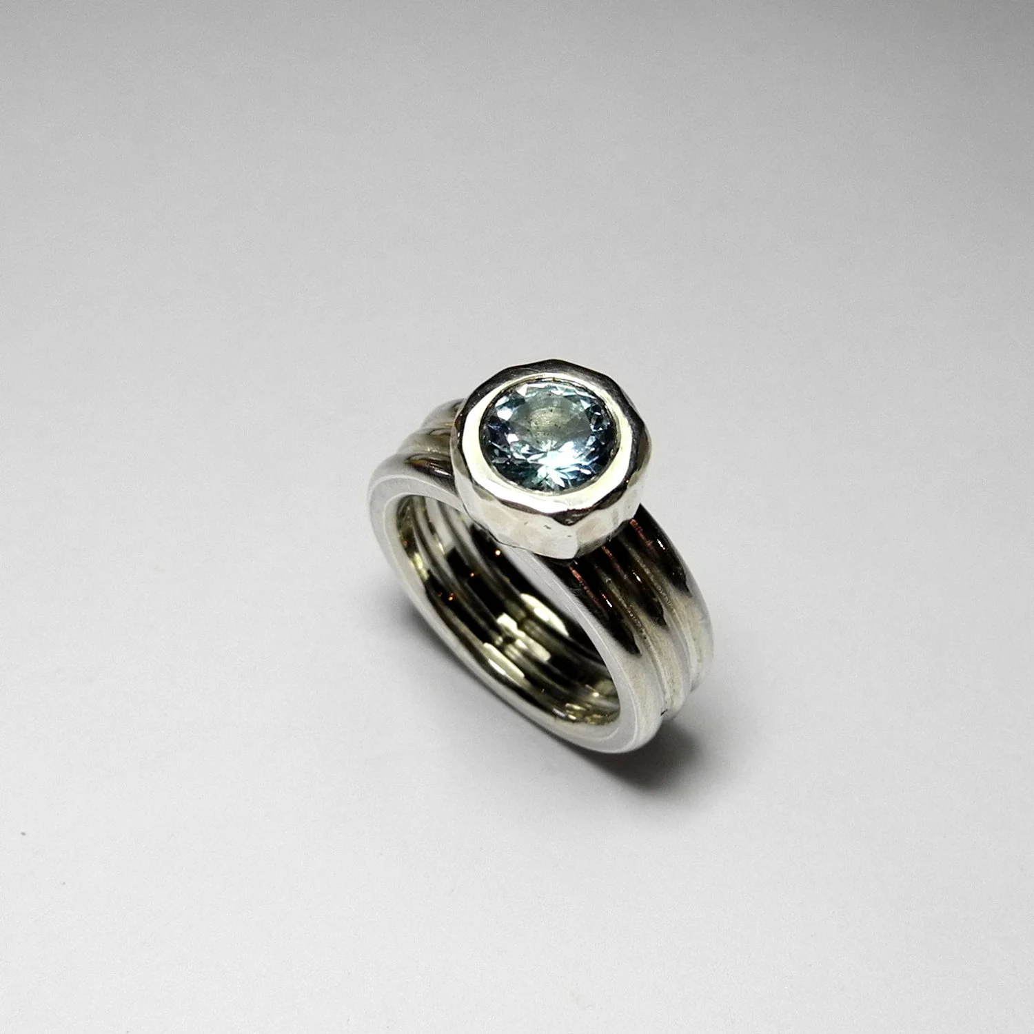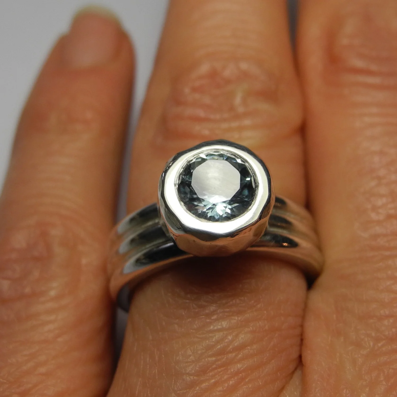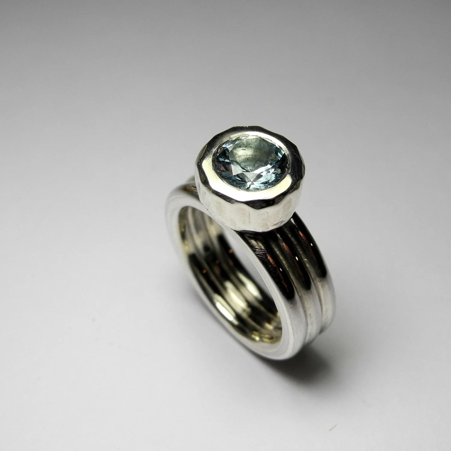 Grade AAA aquamarine (7mm diameter) set in a carved and cast sterling silver, rugged setting, atop a chunky triple silver band. The total width of the band is 6mm.