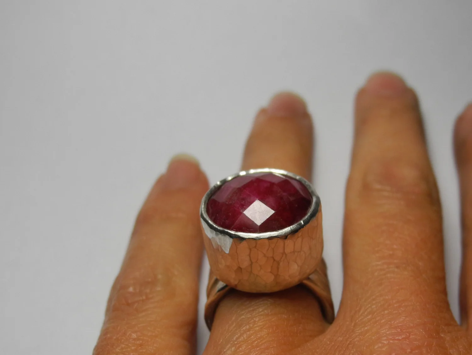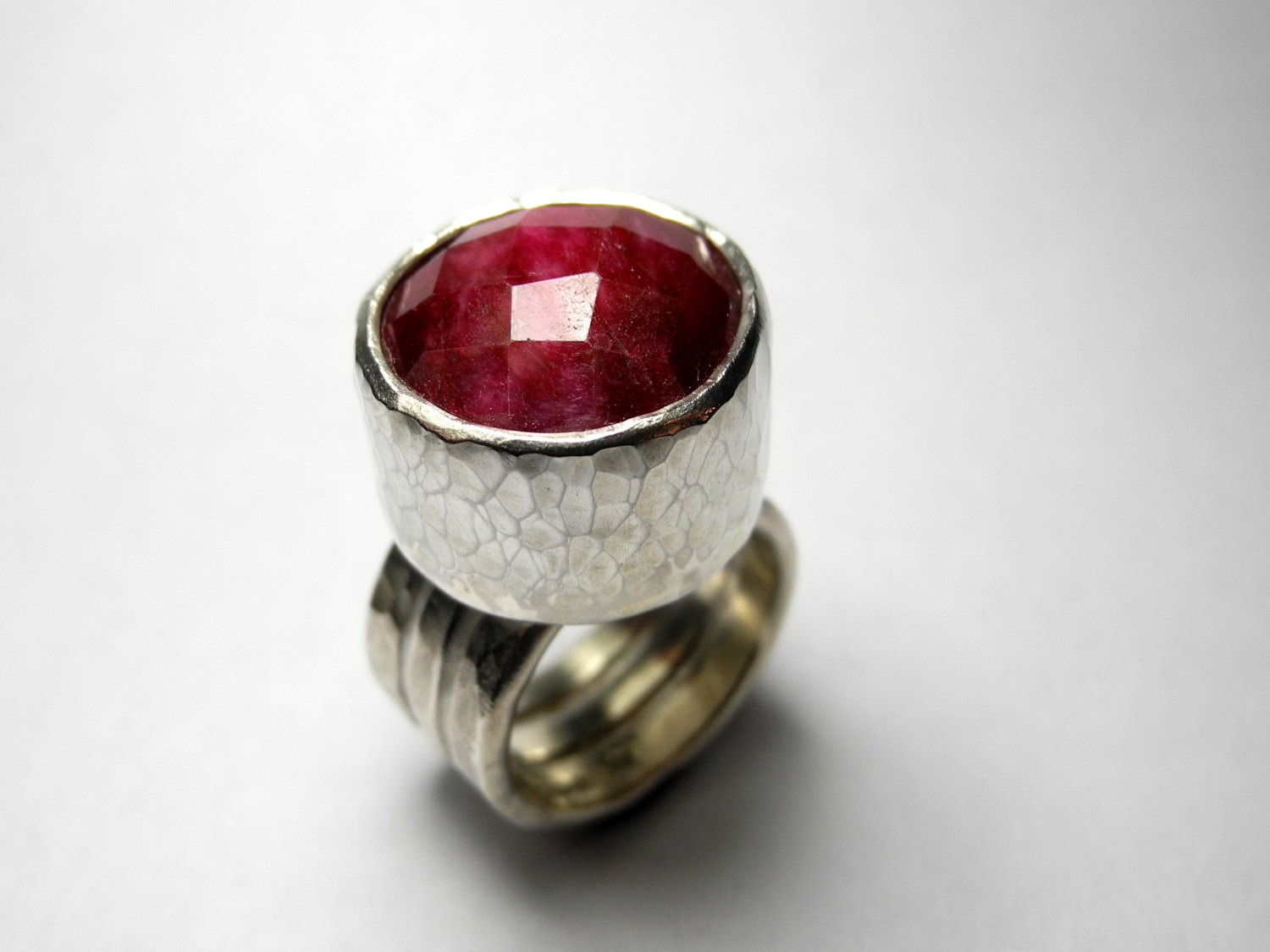 Big and beautiful rose cut ruby (16mm diameter) set in hammered sterling silver on a textured triple band shank.Made to size - please get in touch if your size isn't listed.Please allow 2-3 weeks for delivery.